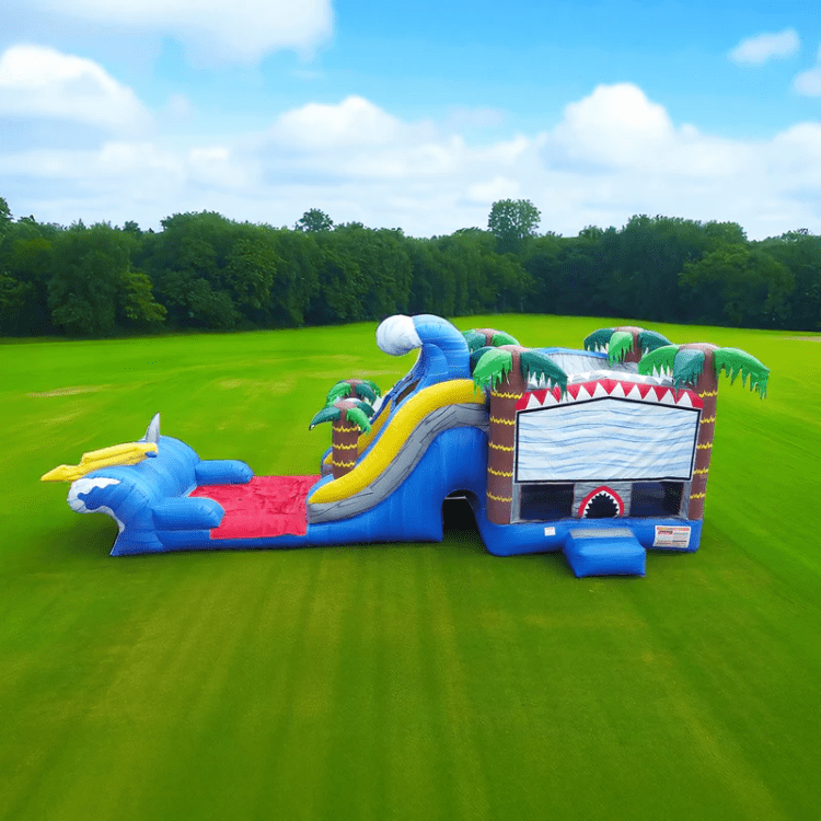 This combo unit features a basketball hoop, two obstacle poles, large climbing wall, two sliding lanes, and a tunnel with obstacle poles! This ride is perfect for birthday parties or company events, and is sure to be the highlight of any occasion. With its eye-catching design and endless fun, the Shark Dual Combo is a surefire hit for any inflatable rental business