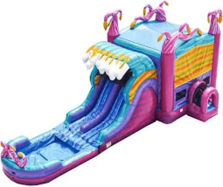 FEATURES: Dual Lane Slide, Bounce House, Non-Slippery Climb Wall, Basketball Hoop, Obstacle Pop Up, Emergency Exit, and Detachable Deep Pool