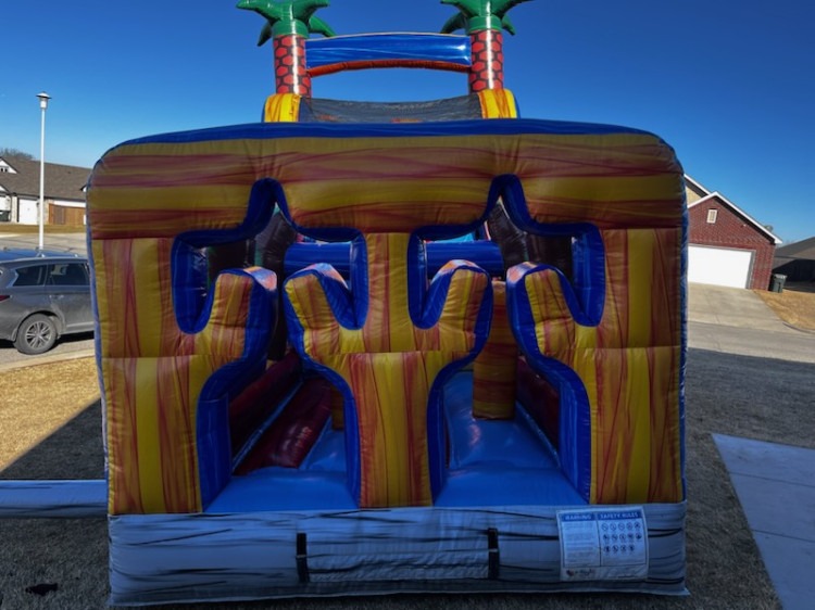 Energize any event with this 18-foot Grey Wolf Dual Lane Obstacle Slide: a tall, eye-catching inflatable that combines a challenging obstacle course with two side-by-side slides so two people can race to the bottom. Built for active play, the front section features crawl-through and climb-over elements that test balance and agility, then funnels participants up a secure, inflatable stairway to the twin sliding lanes. At the top, riders sit and launch down smooth, fast chutes that end in a cushioned run-out zone for a soft landing. The sturdy vinyl construction and reinforced seams are designed to handle continuous use at birthday parties, school functions, team events, and community festivals. Safety features include high side walls on the slides and wide anchor points for secure setup on grass or other flat surfaces. Because it offers two lanes and active obstacles, this rental keeps groups moving and entertained while minimizing wait times, making it ideal for mixed-age crowds looking for a spirited, social challenge.