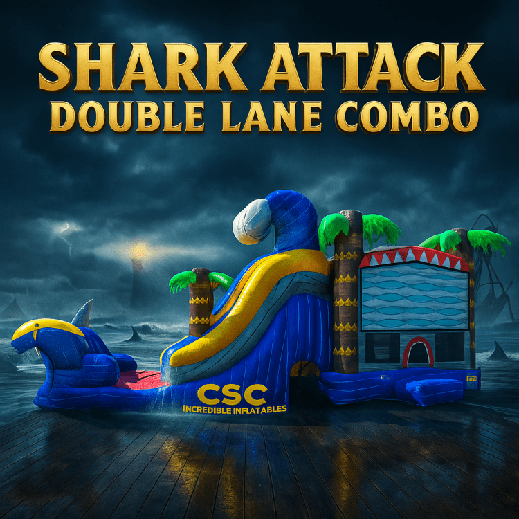 This combo unit features a basketball hoop, two obstacle poles, large climbing wall, two sliding lanes, and a tunnel with obstacle poles! This ride is perfect for birthday parties or company events, and is sure to be the highlight of any occasion. With its eye-catching design and endless fun, the Shark Dual Combo is a surefire hit for any inflatable rental business