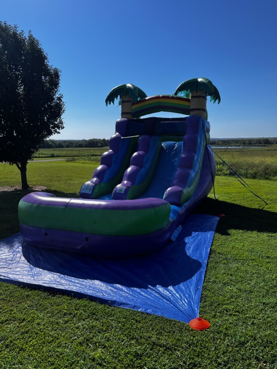 Aesthetically, the purple marble finish gives the slide a modern, tropical vibe that pairs well with island-themed decorations, bright party colors, or more elegant purple-centered palettes. Functionally, it’s a high-impact attraction that draws attention, keeps lines moving with fast cycles, and creates memorable photo moments. Ideal for birthday parties, corporate family days, school carnivals, and community festivals where a combination of excitement and visual flair is desired.