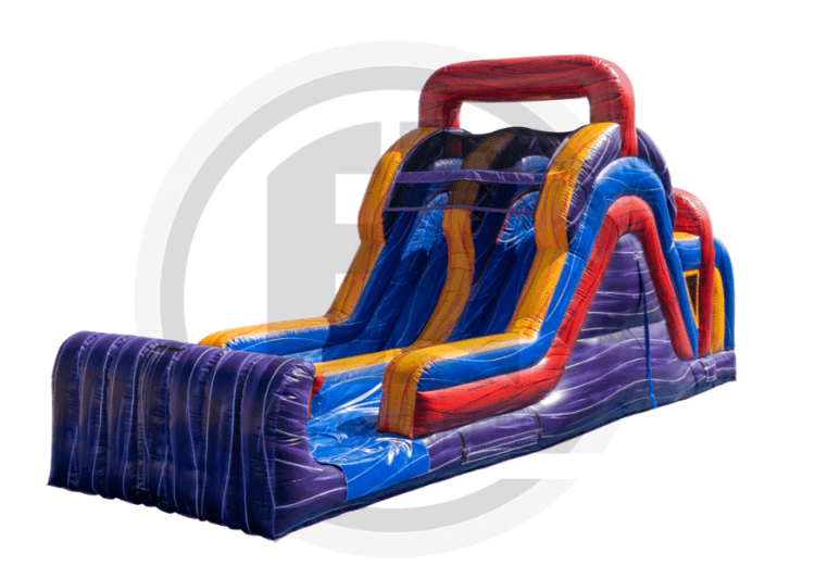 This eye-catching 14 Marble Slide is a tall, single-lane inflatable slide built for fast, fun runs and memorable photo moments. Its marble-patterned graphics give it a modern, energetic look that works for backyard parties, school events, carnivals, and community gatherings. This unique slide features a rear entry with a climb wall to get to the top platform, then slide down a smooth, cushioned surface into a soft landing area designed to absorb impact and keep riders safe. The unit is made for easy setup and takedown by rental crews and performs well outdoors on grass or other flat surfaces when properly staked and secured. Ideal for younger kids, this slide delivers thrills.